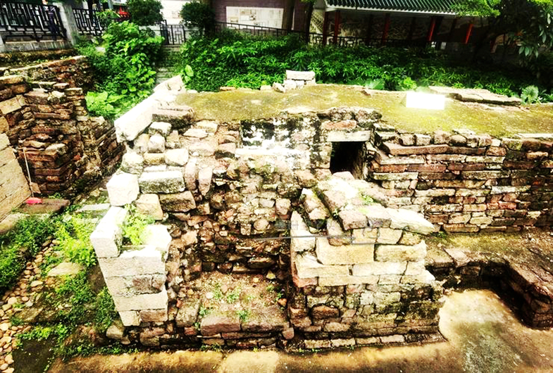 墙体构造:城垣内外由红砂岩石条包边,横竖错缝叠砌,以灰浆粘接,残存 23 层,墙芯以黄褐色土夯实,墙体宽 4.7 米 5.1 米。外壁向上斜收,内壁较直,墙体曾经多次修筑,南墙壁有一处拱形门阙,用白色花岗岩条石砌成,年代稍晚。