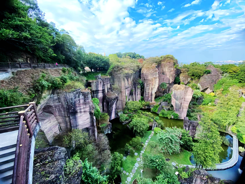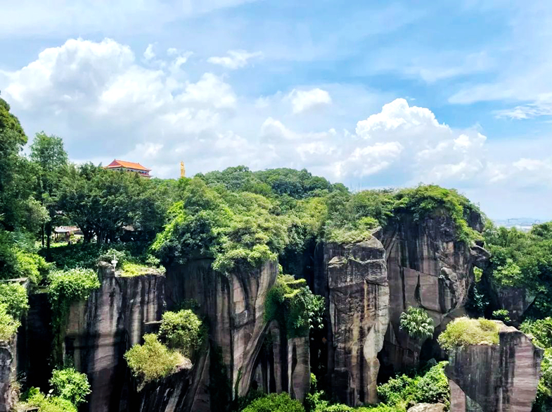 古采石场遗址:是莲花山的核心景点,有两千多年历史,悬崖峭壁、奇岩异洞,被称为“人工无意夺天工”的石景奇观,也是国内外罕见的“人工丹霞”奇观,2001年被评定为全国重点文物保护单位。