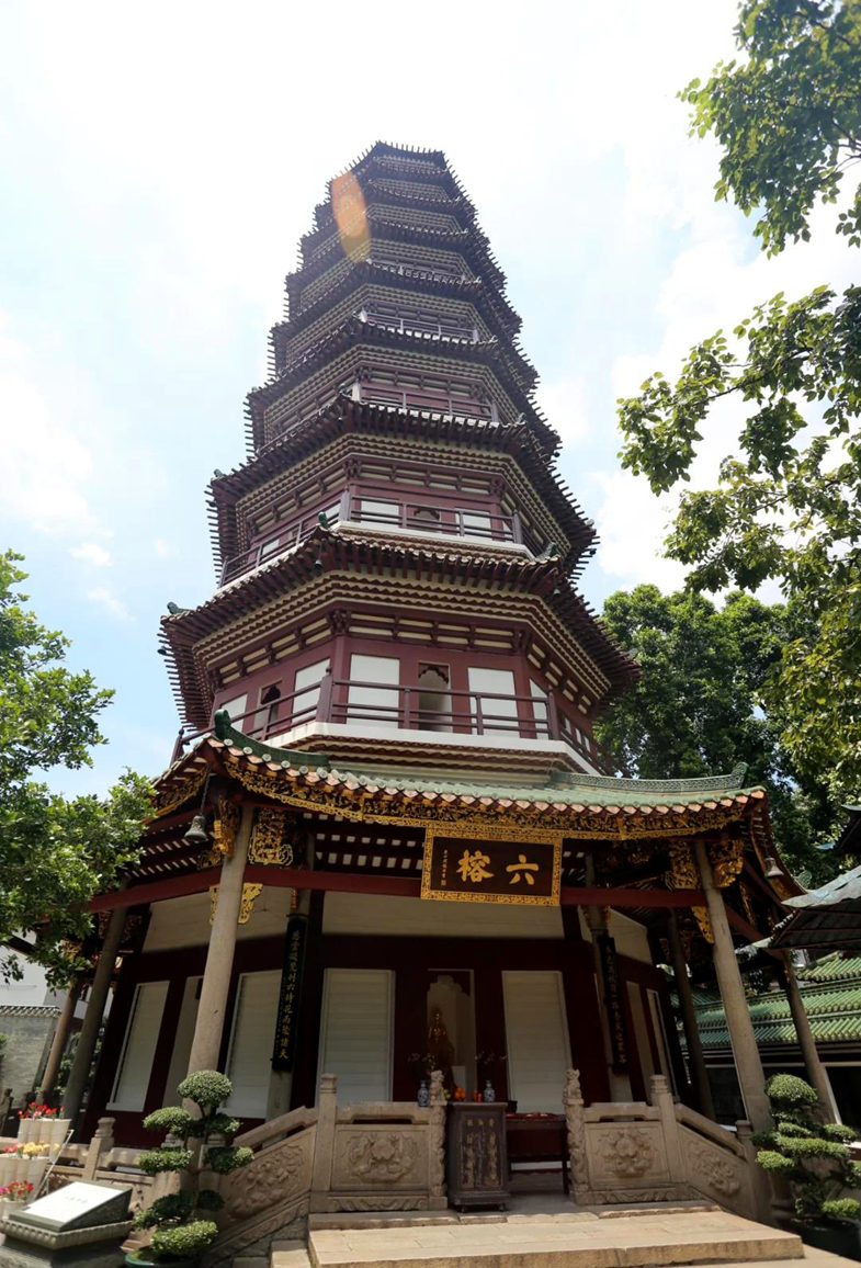六榕寺塔:是六榕寺的核心建筑,平面呈八角形,外观9层,内有暗层8层,共17层,塔高57.6米,是一座仿楼阁式的穿壁绕平座结构的砖木塔。塔刹为元至正十八年(1358年)铸,铜质刹柱身上有1023尊浮雕小佛,还有彩云缭绕的天宫宝塔图,重逾5吨。塔基是用花岗岩石砌筑的九井环基,比较稳固。因塔身檐壁色彩斑斓,红绿白黄互相辉映,旭升日落,观美如花,故又称为“花塔”。