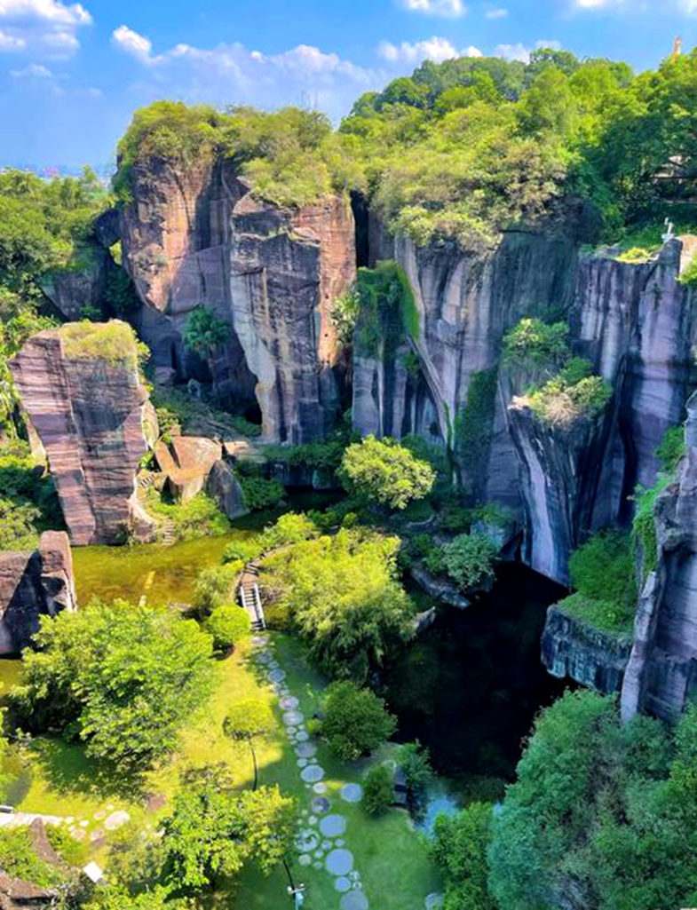 “人工丹霞”奇观:莲花山古采石场是全国重点文物保护单位,与湖北大冶古铜矿场并称中国两大古矿场,其独特的红色砂岩地貌和采石遗迹形成了壮观的“人工丹霞”景观。