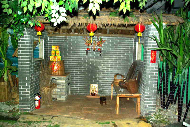 东莞(渔、耕、樵)景观区:利用空间设计,展示东莞水乡人生活场景和农耕情景,陈列旧时农耕的铁犁、铁耙、竹围、筲箕、扁担、旧洒水桶、旧水车、旧禾桶、蚬耙、鱼网等各类文物。