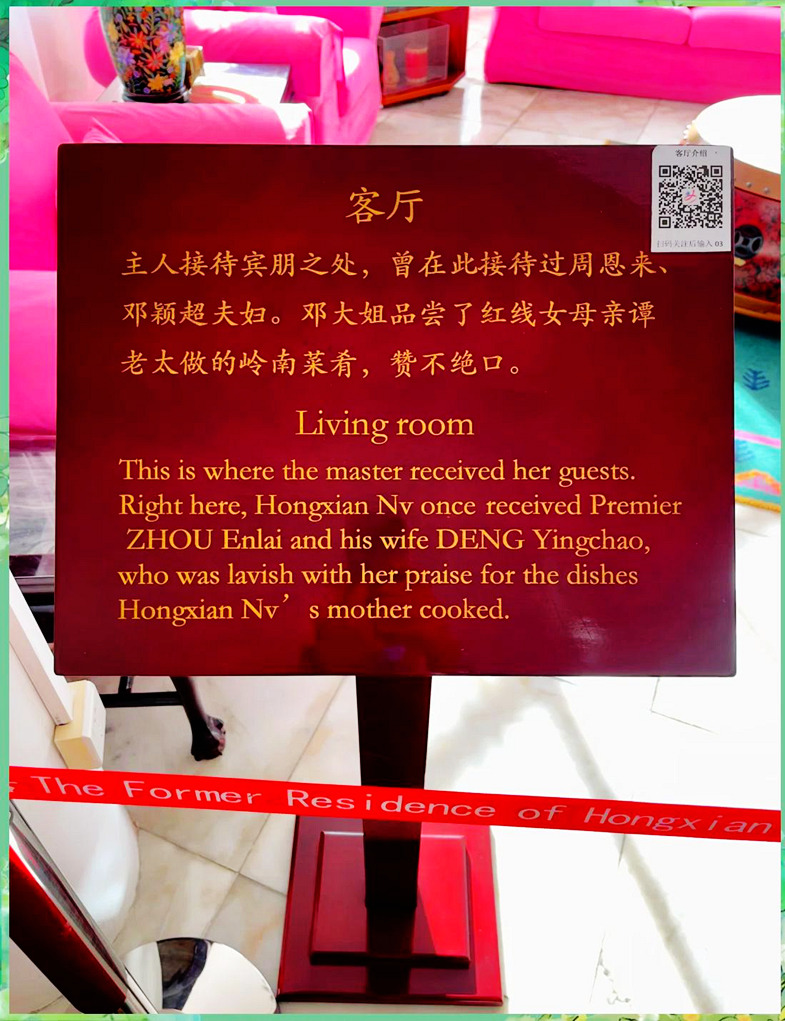 红线女旧居由一栋米白色外墙、粉红屋檐的假三层洋楼和独立花园组成。红线女喜欢红色,客厅的装潢都以粉红色为主调,充满少女心和艺术品味。现按主人生前原貌布置,由客厅、练功室、书房、主卧、衣帽间、画室等组成,是主人接待宾朋、工作、生活的地方……这里花园四季常青,玉兰、桂花等花木多为主人亲手栽植,园中鱼池碧水锦鳞,青苔小径上曾留下了红线女的足迹。半个多世纪以来,这座小院见证了艺术大师大半生的生命历程和粤剧艺术的风风雨雨。