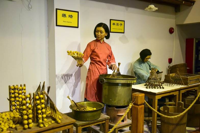 蜡壳包装工艺展厅:此展厅是陈李济独特工艺的集中展示地。煮蜡的大锅热气氤氲,溶蜡时蜡液似灵动的溪流流转不息。工匠们手法娴熟,依次进行串原子、蘸蜡、入丸、封口、剪蒂、盖印等八项精细手工操作,每一个动作行云流水、精准无误,将陈李济独有的蜡壳包装工艺的精妙之处展现得淋漓尽致,让人不禁为古老技艺的魅力所折服。