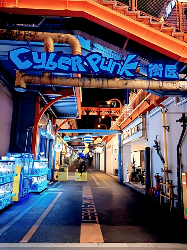 赛博朋克茶饮街:霓虹灯+裸露风管+全息广告屏,岭南凉茶与手打柠檬茶“新旧对冲”。