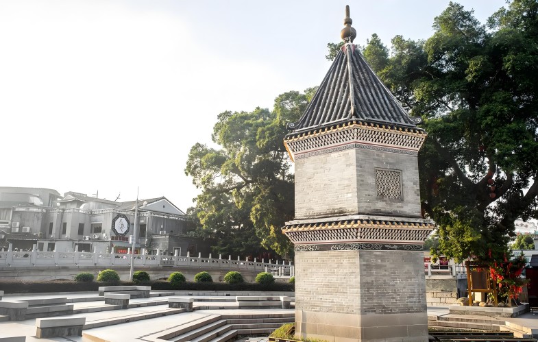 文塔,为六角形两层楼阁式金字尖顶瓦木结构的古塔,塔高13. 6米,外观酷似一支笔尖,属明代中期至清代建筑,塔内供有掌管文人雅士功名命运的文魁星壁像,该壁像由孔子的“正身修心,克己复礼”八字真言所组成,以此告诚:向善、择善、至善,加强自修的处世标准。相传清代广东省出过的3个状元,都曾到文塔祭拜祈福。现在逐渐成为儿童“开笔启智”仪式的场所。