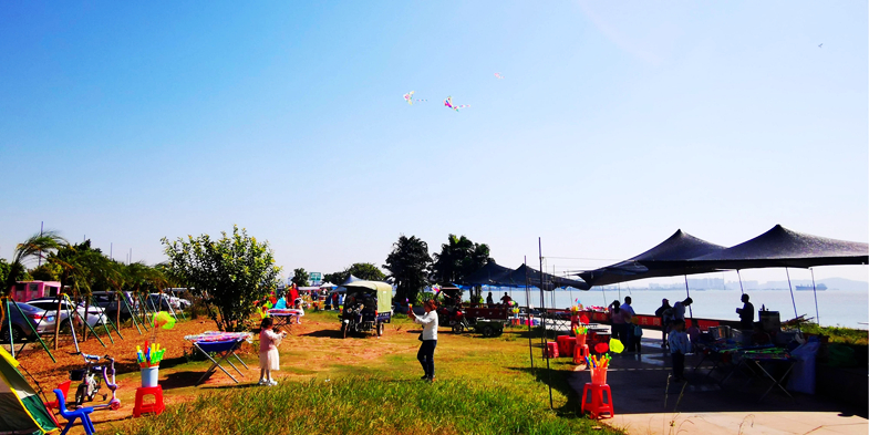 想看尽海鸥岛美丽风光的最好方式莫过于骑行。岛上除了一条环岛的绿道外,还有一条13公里长的公路由北往南贯穿全岛。路上人不多,平坦宽阔,很适合骑行。骑着车感受海风的吹拂,狮子洋上一艘艘巨轮来来往往,沿途阳光穿透绿树,惬意美好。