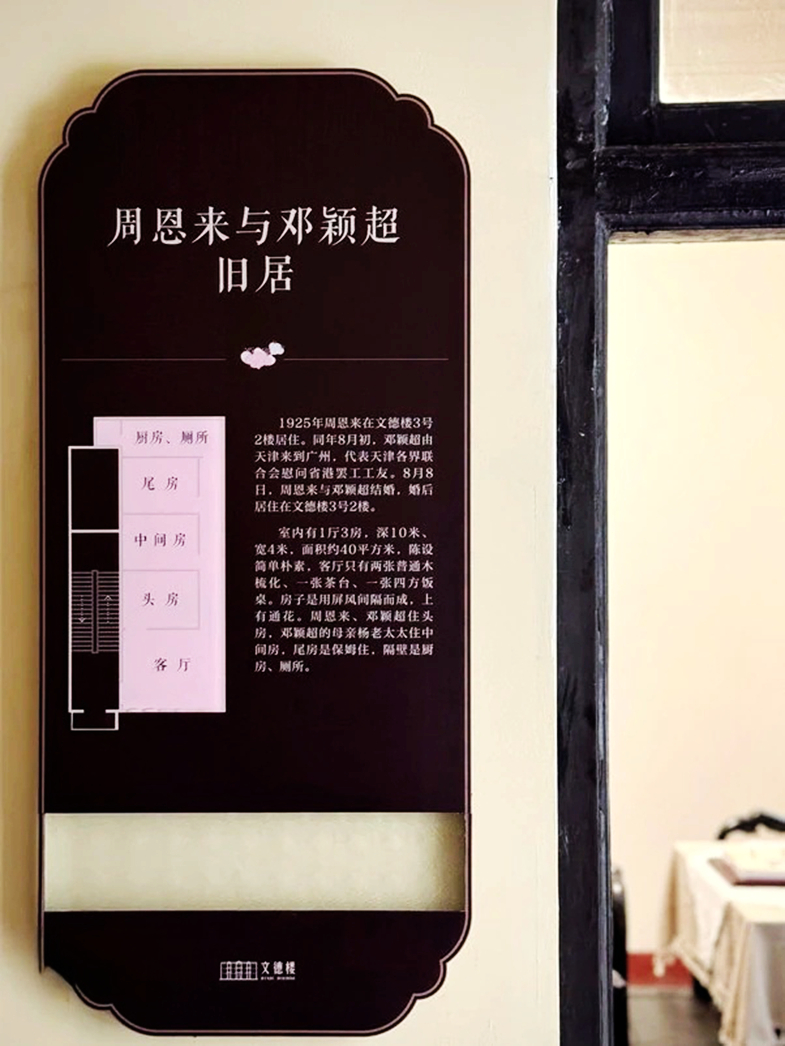1925年秋,中共广东区委军委向业主租赁文德楼的部分房子给工作人员居住。周恩来 、邓颖超住3号,李富春、蔡畅住1号2楼,中山舰舰长李之龙等居住4号2楼。3号2楼有1厅3房,深10米、宽4米,面积约40平方米,陈设简单朴素,客厅只有两张普通木梳化、一张茶几、一张茶台、一张四方饭桌。房子是用屏风间隔而成,上有通花。周恩来、邓颖超住头房,里面除了一张西式大床,一张写字台,几张椅子外,还有两个衣箱和两木箱从法国带回的外文书刊。邓颖超的母亲杨老太太住中间房,尾房是保姆住,隔壁是厨房、厕所。首层曾为周恩来的弟弟周恩寿居住。