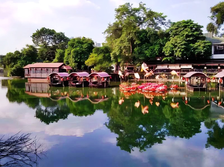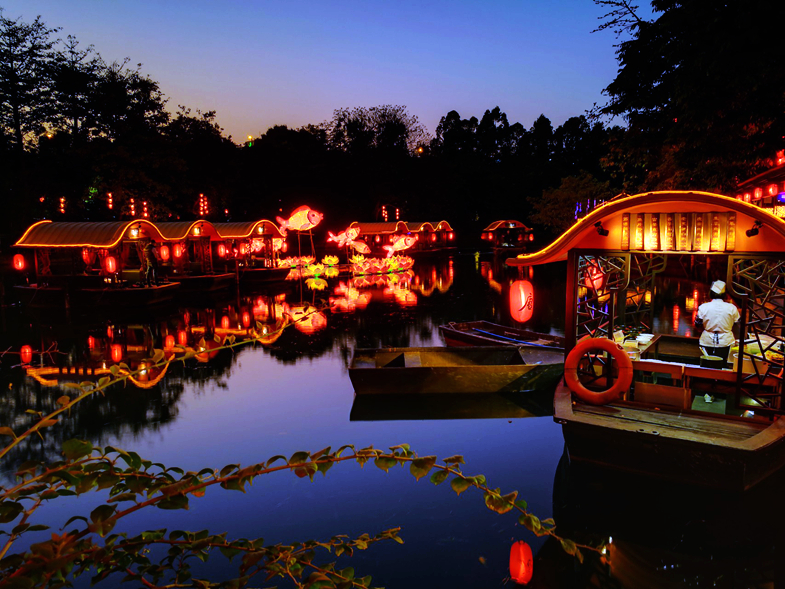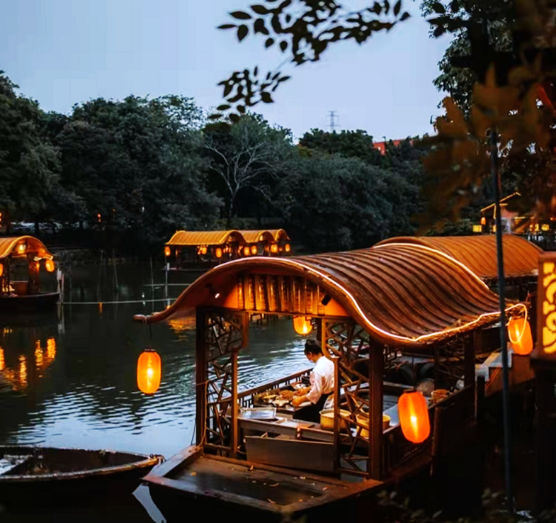 花船体验:湖面上停泊着几艘装饰华丽的花船,食客可以登船用餐,体验岭南水乡的独特风情。