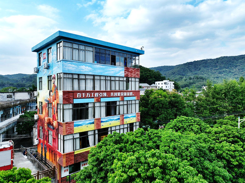 手绘漫画风景墙:白山村的房屋外墙上绘有精美的水彩画,展现了农人种田、秋日丰收、采摘等场景,充满了乡村的淳朴生活气息。