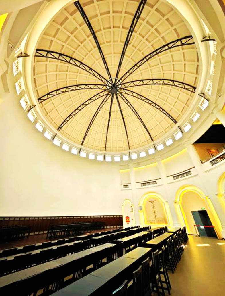 建筑特点 :自南至北有大门(已毁)、石砌荷池拱桥、主楼、后座两层砖木结构的楼房(已毁)。主楼前圆后方,大厅屋顶为半球形,8 根大柱环列,空间开阔,有内外回廊,廊两层,1948 年在大厅入口处建 4 根罗马式大圆柱。
