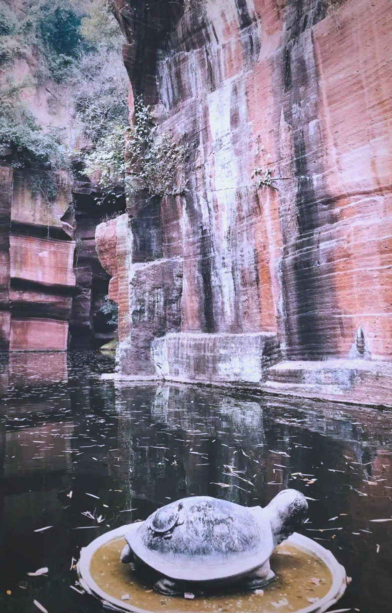 自然景观独特 :拥有典型的丹霞地貌特征,罉塘潭四面悬崖环绕,崖高 23.7 米,长 110 米、宽 65 米,潭水终年不涸,水质清澈,倒映着红墙,与绿树红花相互映衬,形成独特的山水画卷。整个岩塘形状似罉,塘内还有一 4 米见方的小岛,酷似罉盖,因此得名。