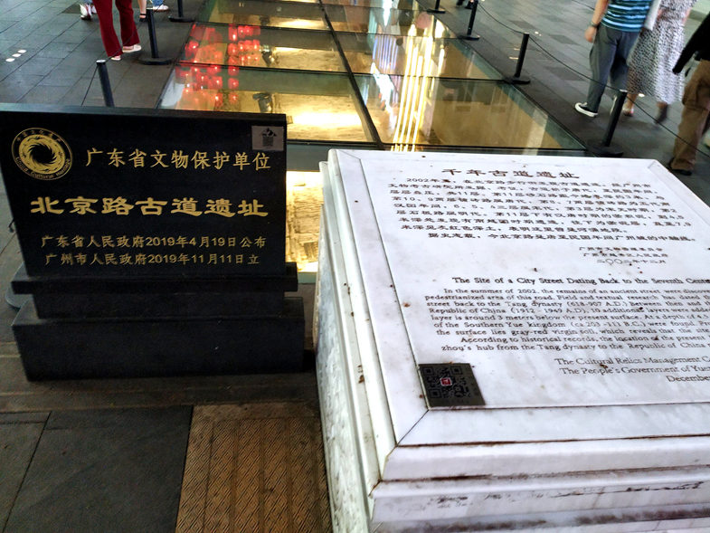 历史背景:北京路古道遗址见证了广州城的历史变迁。2002年7月初,北京路步行街在整饰工程路面开挖过程中,出土了大量砂岩石条与古城墙砖。经过两个多月的抢救性挖掘,掘出了自南汉以来共五朝11层的路面和宋代拱北楼基址。按照文物保护与利用的方针,越秀区政府决定结合北京路步行街整修工程,对南北两段的地下文物进行保护,并用玻璃钢罩覆盖其上向市民展示。2003年1月,经过整饬后的“古道遗址”正式对外开放,被誉为“中国第一条千年古道”。2008年12月,”千年古道遗址“被广州市政府列为文物保护单位。