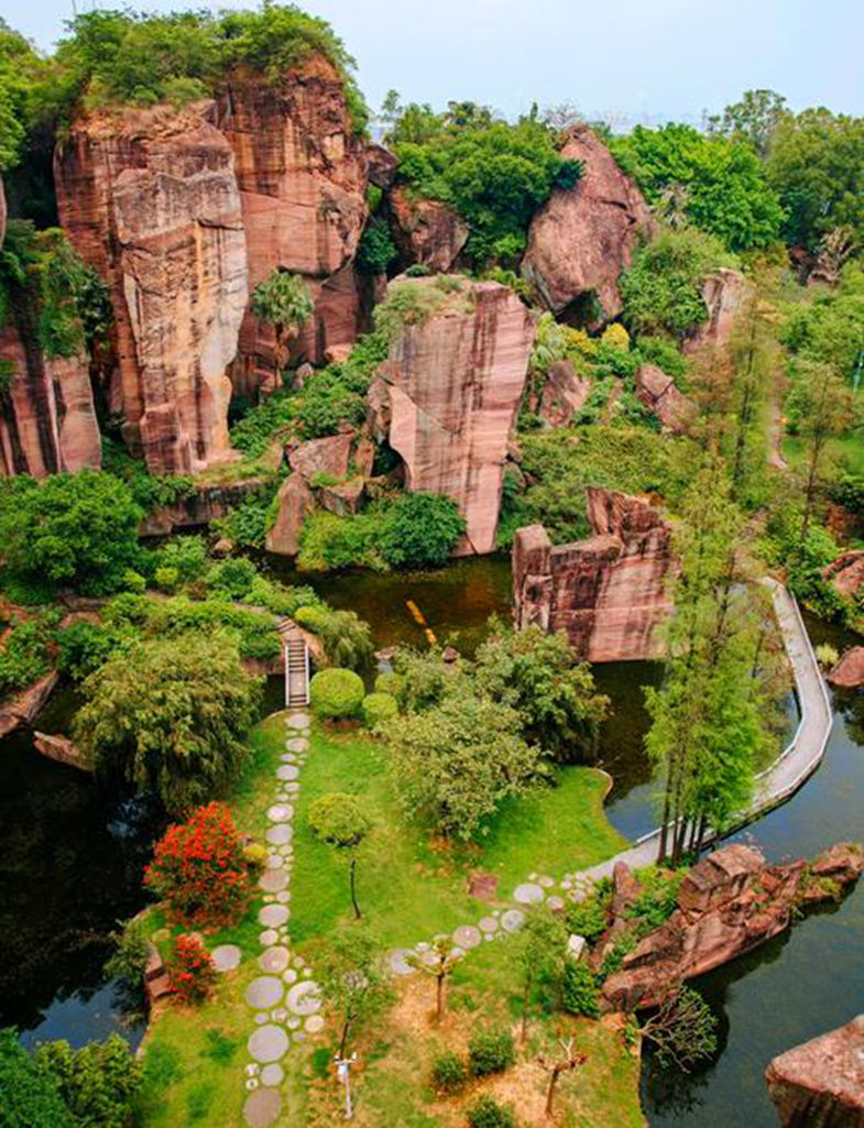 莲花山古采石场的开采历史可追溯至西汉初年,当时南越先民发现莲花山有连绵上千米的褚红色砂岩,质地坚硬、密度适中、颗粒明显,是建造宫殿的重要选材。他们驾船来到莲花山采石,经海道将石材运回当时的番禺城,用于建造南越国宫署和南越王墓等重要建筑。秦汉时期,广州已有发达的造船工业和对外航线,莲花山的石材通过水路运输,为广州的城市建设和发展提供了重要的物质基础。明代至清代鸦片战争之前,为供应广州的城市发展需求,莲花山古采石场被大量开采,留下众多奇岩异洞和悬崖绝壁。然而,长时间的过度开采也导致了资源的枯竭和环境的破坏。