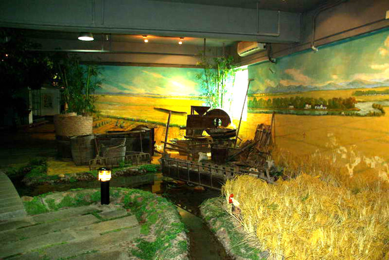 东莞(渔、耕、樵)景观区:利用空间设计,展示东莞水乡人生活场景和农耕情景,陈列旧时农耕的铁犁、铁耙、竹围、筲箕、扁担、旧洒水桶、旧水车、旧禾桶、蚬耙、鱼网等各类文物。