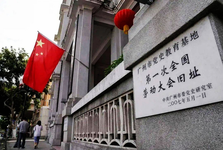 珠江南岸,广州解放大桥西侧,一栋坐南朝北的4层白色洋楼在绿树掩映下格外显眼。楼顶,巨大的红色五角星装饰在阳光下熠熠生辉,一楼门匾上书“第一次全国劳动大会旧址”(以下简称“一劳大”旧址),一语道破洋楼不平凡的身世。穿前厅、入后院,主楼后面藏着一栋由仓库改建而成的礼堂。“这栋楼曾是广东机器工会办公场所,‘一劳大’便是在这座礼堂召开的。”“一劳大”旧址工作人员指着礼堂外墙“入党誓词”说,“一劳大”旧址如今已成为广东省爱国主义教育基地、广东省红色革命遗址、广州市党史教育基地、广州市新时代文明实践中心。