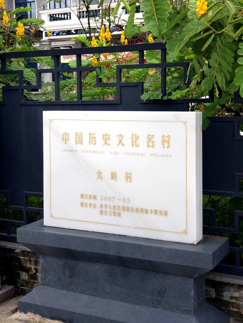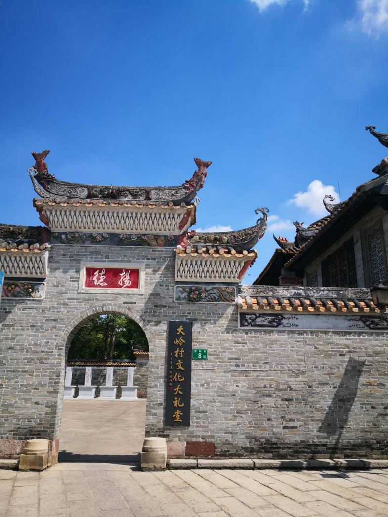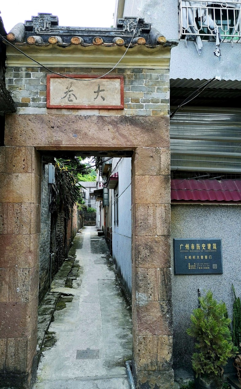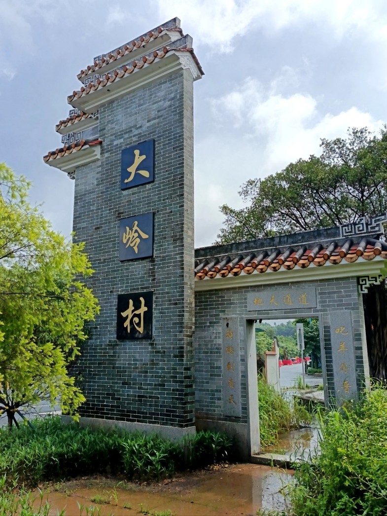 建村历史南宋绍兴元年(1131)建村,因位于番禺9菩山脚,故称菩山村。明嘉靖年间(1522—1566),因该村依大岭山而建,更名为大岭村。该村古建筑群约 9000 平方米,以一条古街为主轴,旁生里巷,形成鱼骨状的街巷格局,机理清晰。村中的文塔、祠堂、庭院、蚝壳屋等不同建筑形制的古民居是珠江三角洲地区历史建筑的典型代表。遗存古迹有:建于南宋的陈氏大宗祠柳源堂;始建于明嘉靖年间的显宗祠,又名凝德堂,是陈氏九世祖祠于清乾隆辛酉年(1741)重修,匾额是明万历甲辰年(1604)进士、巡按御史王命璇题书,门口匾额为广州将军、两广总督耆英题书;建于清康熙年间的龙津桥,桥边的大魁阁塔始建于清光绪甲申(1884),底层门额“作镇菩心”为清咸丰九年已未科探花、礼部左侍郎李文田所题,二层南面窗额“司命司忠”为清道光三十年庚午科榜眼、翰林院编修、大岭村人许其光题书;位于村北口的“贞寿之门”石牌坊,为表彰陈华达之妻蔡氏、妾冼氏守节教子有方且寿享百龄而立,据楹联记述,此四个字乃光绪皇帝所赐御笔题书。村内留存文物保护单位共有 23 处,其中大魁阁塔、龙津桥为广州市文物保护单位。第一批中国传统村落(广州首个),第三批中国历史文化名村(广州首个) 大岭村地处偏远,历史记载很少,祠堂中保存的族谱是考证大岭村形成历史的重要民间材料。其建村历史有两种说法:据陈氏族谱记载,大岭村陈氏祖先保昌公原籍江西泰和县流溪乡古井巷。于北宋仁宗癸亥年(1023年)奉诏至广东南雄县教谕,后晋知县。至三世遗庆公,因天灾人祸,于南宋绍兴元年(1131年)自南雄珠玑巷迁至菩山村开村繁衍。另据许氏族谱记载,大岭村开村主要是原籍浙江绍兴府许氏,许氏有女在广东始兴郡,后册封皇后,一次皇后回乡探亲,太监诬陷其兄造反,故被迫于北宋宣和元年(1119年),从广东南雄珠玑巷逃至菩山开村。