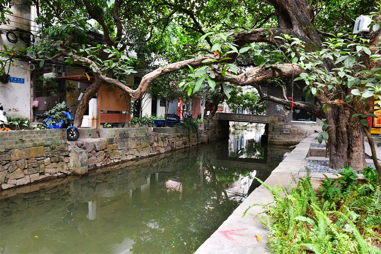 小洲村东北方向通往珠江后航道,古村区域四面环水且内部也水网密布,河涌是小洲村落组团的自然分界,水乡村落建筑群天然地被水网系统划分成北部、西部和南部三大组团。