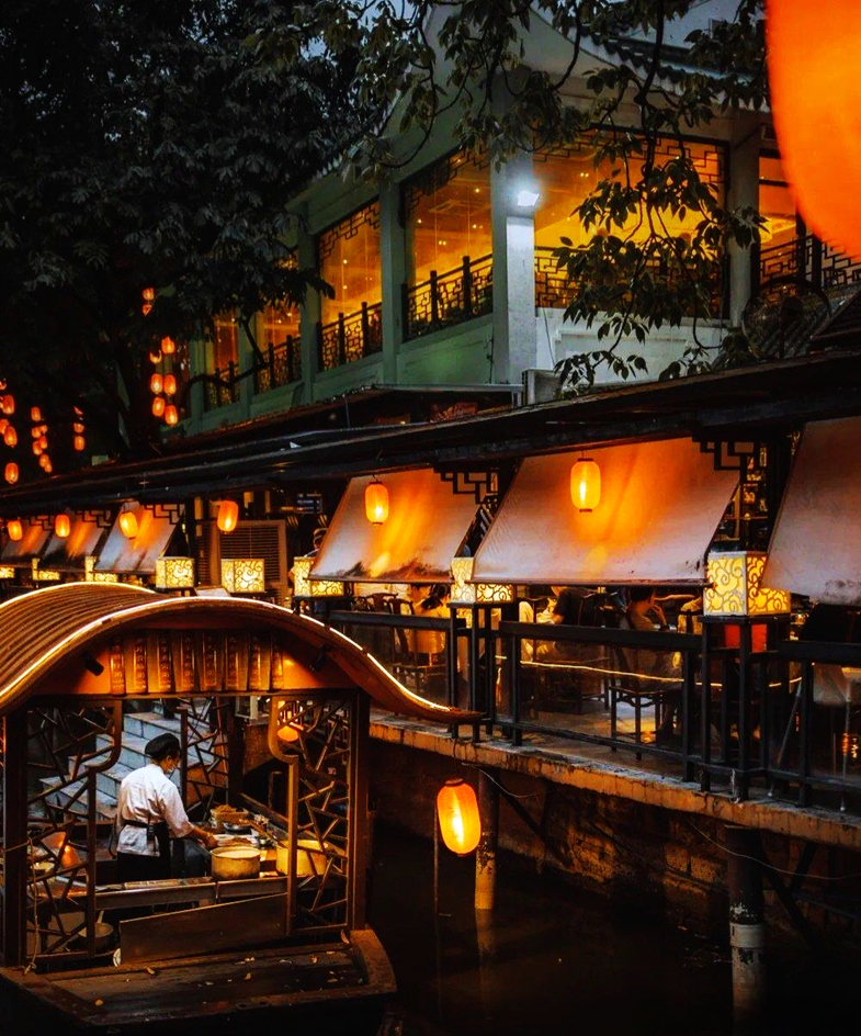 花船体验:湖面上停泊着几艘装饰华丽的花船,食客可以登船用餐,体验岭南水乡的独特风情。